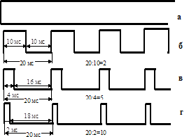 Рисунок 1.2- Схематическое изображение ультразвуковых непрерывного (а) и импульсного сигналов со скважностью 2(б), 5(в) и 10(г)