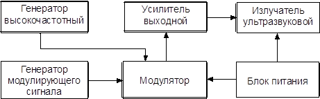 Генератор высокочастотный создает немодулированные электрические колебания. Усиление мощности этих колебаний происходит в выходном усилителе. К выходному усилителю подключен излучатель ультразвука, в котором электрические колебания преобразуются в механические. Модулятор необходим для создания импульсного режима (6).
