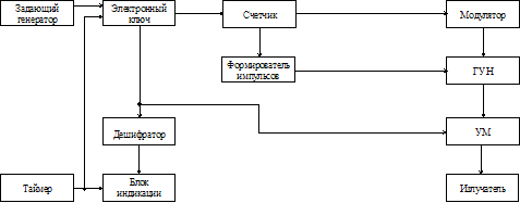 Исходя из анализа современных устройств для лечебного и терапевтического воздействия была разработана структурная схема устройства, которая включает в себя следующие блоки: задающий генератор, электронный таймер реального времени, электронный ключ, дешифратор, формирователь импульсов, генератор управляемый напряжением (ГУН), усилитель мощности (УМ), счетчик, модулятор, блок индикации режима работы, излучатель, совместная работа которых должна обеспечивать технические данные в соответствии с техническим заданием (рисунок 3.1).