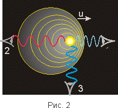 На рисунке показано, что световое или электромагнитное поле, окружающее излучатель, при движении последнего деформируется: сжимается в направлении движения излучателя, демонстрируя наблюдателю 1 так называемое голубое смещение спектра излучения; и растягивается в противоположном направлении, демонстрируя наблюдателю 2 красное смещение спектра. Эти явления известны как продольный эффект Доплера. Видно также, что наблюдатель 3 в этом случае должен зафиксировать поперечный эффект Доплера в виде более слабого голубого смещения спектра”.