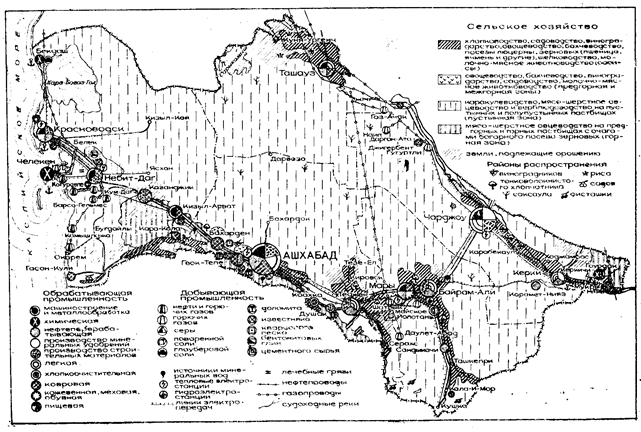 б) отрасли социальной инфраструктуры. Значительные изменения произошли и в территориальном размещении производительных сил государства. Почти во всех районах Туркменистана интенсивно осваиваются минерально-сырьевые, земельные, водные ресурсы, рационально используются имеющиеся трудовые ресурсы, экономические потенциалы. С учетом специфических особенностей в Туркменистане выделяются экономические районы и подрайоны, формируются внутриреспубликанские территориально-производственные комплексы.