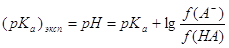 Таким образом, истинное значение рКа будет отличаться от экспериментального на величину логарифма отношения коэффициентов активности. Обычно при титровании ионная сила равна 0,1 или больше, следовательно, отношение