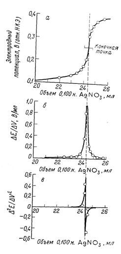 Для определения конечной точки потенциометрического титрования можно использовать различные способы. Наиболее простой состоит в построении графика зависимости потенциала или рН от объема реагента (рис. 2.1. а). Затем визуально определяют среднюю точку участка, соответствующего вертикальному подъему кривой, и принимают ее за конечную точку. Предложены различные механические способы установления средней точки, но они ненамного улучшают точность ее нахождения.
