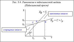 Поскольку фактические расходы всегда равны выпуску, а фактические расходы равны планируемым расходам только, когда непредвиденные инвестиции в запасы равны 0, то равновесие товарного рынка наступает тогда, когда фактические расходы равны планируемым (Е = Е р) и соответственно планируемые расходы равны выпуску (Е р = Y).