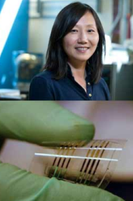 Вверху: профессор Чжэнань Бао (Zhenan Bao) – лидер стэнфордского проекта. Внизу: такая простая полимерная плёнка с алюминиевыми проводниками послужила отправной точкой в построении новой кожи (фото L.A. Cicero/Stanford University, Stefan C. B. Mannsfeld et al./Nature Materials).