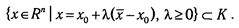 Множество К называется конусом с вершиной в точке x0, если x0 € К , и из того, что некоторая точка х принадлежит К ( х € К ), следует, что в К содержится и луч, начинающийся в х0 и проходящий через х, т. е.