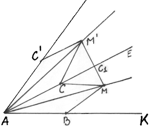 С этой целью применим поворот плоскости вокруг точки А на угол А=α. Точка В перейдет в точку С, точка С в С', точка М в М'. Теперь легко заметить, что численное значение х= МС+МВ = МС +М'С зависит только от расположения точки С, которая определит граничное значение элемента х = МС+М'С, и если C1=MM'