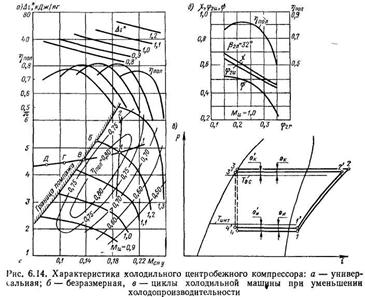 (Рис.6.14, б) и представляют собой экспериментальную основу при проектировании. Энергетические показатели центробежного компрессора в эксплуатации определяются как его характеристикой, так и сетью, на которую она работает. Для компрессора паровой холодильной машины, например, сетью является система теплообменных аппаратов: испаритель, конденсатор и соединительные трубопроводы. Допустим, что при расчетном режиме совместная работа компрессора и сети определяется точкой А. Рассмотрим изменение режима работы, при котором холодопроизводительность уменьшается, а средние температуры источников остался неизменными (Рис.6.14, в). Перепады температур
