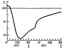 С.И. Савинов (1913), Кимбалл (1918), H.H. Kaлитин (1920) и другие авторы установили, что после сильных вулканических извержений взрывного характера происходят резкие уменьшения солнечной радиации. В таких случаях средняя для больших территорий величина прямой радиации в течение нескольких месяцев или лет может быть понижена на 10—20%. Пример такого изменения радиации представлен на рис. 2.2.1, где изображено изменение отношения средних месячных значений прямой радиации при безоблачном небе к их нормам после извержения вулкана Катмай на Аляске в 1912 году.