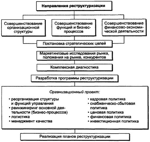 Реструктуризация подразумевает системный характер оптимизации функционирования компании. Она включает многоаспектный и взаимоувязанный комплекс мероприятий, процессов, методов, начиная с комплексной диагностики компании и до реорганизации как организационной структуры, так и бизнес-процессов на базе современных подходов к управлению, в том числе методологии управления качеством, реинжиниринга бизнес-процессов, информационных технологий и систем.