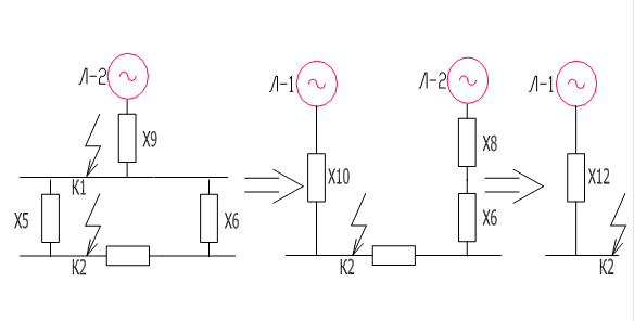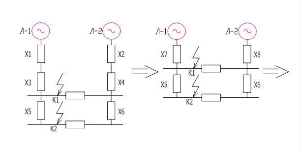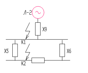 Для расчета тока короткого замыкания в точке К2 необходимо последовательно сложить сопротивления Х7 и Х5: