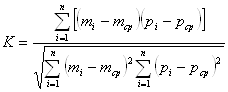 где: mi, pi – значения соответствующих параметров (между которыми устанавливается теснота связи) по i-му измерению;