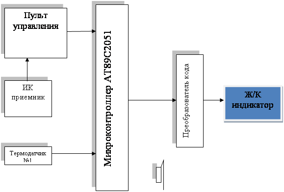 Основой устройства является микроконтроллер AT89C2051 фирмы «Atmel». Для отображения информации используется жидкокристаллический индикатор типа ЖКИ13-8/7-02. Несмотря на то, что в настоящее время доступны ЖКИ с встроенными контроллерами, иногда оказывается целесообразным применение специального ЖКИ. Причин может быть несколько. Распространенные ЖКИ со встроенными контроллерами обладают целым рядом недостатков: отсутствие десятичных точек, плохой угол обзора, недостаточный в некоторых случаях размер символов. В то же время существует доступная и довольно удобная в использовании микросхема драйвера ЖКИ КР1820ВГ1. Она выпускается Минским ПО «Интеграл».
