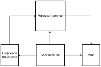 Для подключения цифрового термометра используется три порта ввода/вывод. На рисунке 2.4 приведена схема включения термометра.