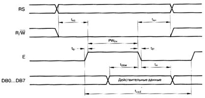 Установить значение линии RS Вывести значение байта данных на линии шины DB0...DB7 Установить линию Е = 1 Установить линию У = 0 Установить линии шины DB0...DB7 = HI |