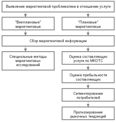 Маркетинговое исследование услуги или ее рыночного окружения представляет собой систематические мероприятия по получению оперативной информации в отношении данных, описывающих текущее или перспективное (прогнозное) состояние самой услуги или ее маркетингового окружения, а также анализ и отражение данных в форме, необходимой для решения стратегических и тактических задач, стоящих перед фирмой. Проведенные в плановом порядке маркетинговые исследования дают возможность получать конкурентные преимущества, снижать финансовые и коммерческие риски предпринимательской деятельности, определять отношение покупателей к оказываемой услуге, давать оценку стратегической и тактической деятельности фирмы, повышать эффективность коммуникационных рыночных мероприятий, определять оптимальные сегменты позиционирования услуг, определять характер жизненного цикла услуг.