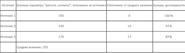 Критерий "достоверности" маркетинговой информации определяет уровень точности получаемой информации. Расчет достоверности источника маркетинговой информации производится по сравнительной схеме, представленной в табл.1.1. Схема расчета критерия достоверности сводится к определению степени отклонения полученного значения от среднего по источникам: выбирается исследуемый параметр (емкость сегмента в нашем примере) и производится его сравнение со средней величиной, рассчитанной по ряду других источников.