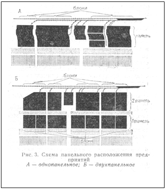 2) последовательное многорядное (в виде панелей) размещение, как правило, параллельно селитебной территории по принципу уменьшения производственной вредности предприятия по мере приближения к ней.