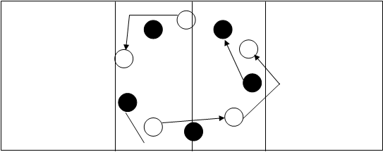 Описание игры: игроки передают мяч друг другу, поворачивая туловище направо, достигнув крайнего игрока, мяч передается в обратном направлении поворотом налево.
