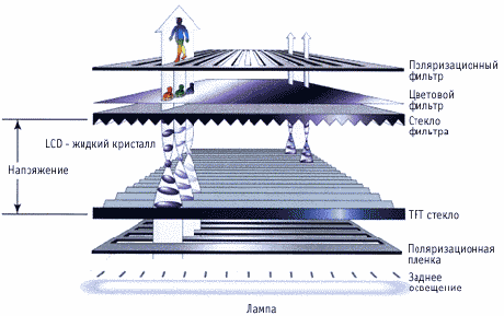 Экран LCD представляет собой массив маленьких сегментов, называемых пикселями, которыми можно манипулировать для отображения информации. LCD имеет несколько слоев, где ключевую роль играют две панели, сделанные из свободного от натрия и очень чистого стеклянного материала, называемого субстрат или подложка. Слои собственно и содержат тонкий слой жидких кристаллов между собой.