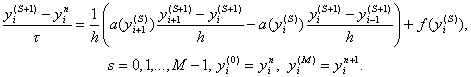 Здесь s – номер итерации. Как видим, нелинейные коэффициенты берутся с предыдущей итерации, а в качестве начального приближения для yin+1 выбирается yin. Это начальное приближение тем лучше, чем меньше шаг t . Число итераций M задается из соображений точности. В задачах с гладкими коэффициентами при k(u) і c1 > 0 часто бывает достаточно провести две – три итерации. Значения yi(S+1) на новой итерации находятся из системы (31) методом прогонки. При M = 1 итерационный метод (31) совпадает с разностной схемой (29).