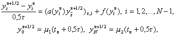 из которой находятся промежуточные значения yin+1/2, i = 0, 1,…, N. Затем на втором этапе используется симметричная шеститочечная схема для уравнения (28), в которой нелинейные коэффициенты a(y), f(y) вычисляются при y = yin+1/2, т.е. схема