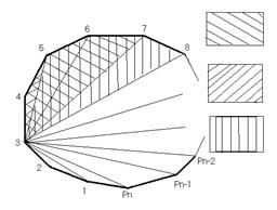 следующим образом: соединяем диагоналями через одну вершину данного n-угольника, причем выделением считается получение последующего a-угольника из предыдущего, используя не менее двух диагоналей. Выделение ведется до тех пор, пока не получится четырехугольник или треугольник (r = 4 или r = 3 (r – остаточный коэффициент)). Назовем каждое такое выделение циклом и введем величину, которая будет “считать” их (d). Для каждого d существует 2d+1 многоугольников, первый многоугольник для данного d ,будет (2d+1+1)-угольником. Для первой половины (для данного d) многоугольников r = 3, для второй - r = 4. Последним многоугольником, для которого r = 3 будет (3×2d )-угольником. Окончательно получаем: r = 3, если nÎ(2d+1+1; 3×2d), в противном случае r = 4. За каждый цикл, если проводить дополнительные диагонали, будет добавляться по 2 пересечения и через d циклов число пересечений достигнет максимума в полученном данным способом разбиении. Обозначим это число буквой k.