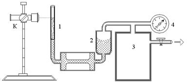 Для определения объема жидкости, протекающей через щелевой зазор, использовалась (рис.2) калиброванная измерительная трубка 1, высота столба жидкости в которой фиксировалась катетометром К с точностью 0,01 мм. Для создания перепада давлений вискозиметр через балластную трубку 2 подсоединялся к ресиверу 3 с манометрическим устройством 4. При измерении давлений P ~ 102 ¸ 104 Па использовался водяной, а для больших давлений (до 20 КП) – образцовый механический манометр. Для уменьшения объема пленки жидкости, остающейся за опускающимся мениском, диаметры измерительной трубки выбирались небольшими (~ 1 мм). Поверхности пластин, образующих зазор, и другие металлические детали, входящие в контакт с исследуемой жидкостью, перед сборкой вискозиметра для очистки от органических загрязнений промывались растворителем и просушивались.