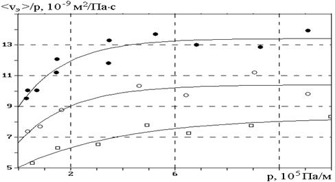 Рис.4. Зависимость отношения <vэ>/ p – относительной (по отношению к градиенту давления p) экспериментальной средней скорости течения масла МРХ-30 через щелевые зазоры вискозиметра от градиента давления . Величина зазоров: D1 = 39,7 мкм (·), D2= 35 мкм (О) и D3 = 30 мкм ( ). Т = 294 К. Сплошные линии – аппроксимация зависимостью (2)