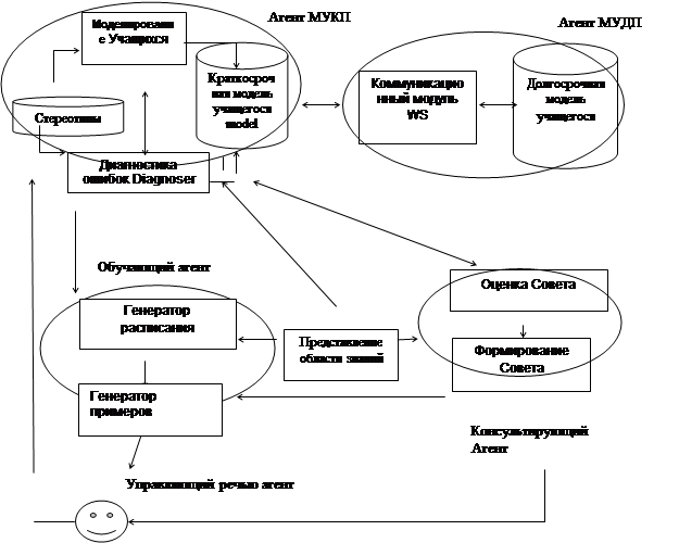 И Консультирующий Агент (Advising Agent) и Обучающий Агент (Tutoring Agent) направляет результаты своей работы Управляющему речью агенту (Speech-driven Agent), который также расположен на стороне клиента. Управляющий речью Агент (Speech-driven Agent) отвечает за представление информации в единой и легкой доступной форме. Для того чтобы сделать взаимодействие более естественным и приятным, для представления совета учащемуся (system’s advice to the learner) используется анимированный Управляющий речью Агент (Speech-driven Agent) Такие персонажи (characters) выполняют развлекающую роль и несут эмоциональное значение, что может помочь снизить первоначальный барьер для начинающих изучать компьютерные приложения. К тому же, такие персонажи повышают эффективность комплекса, увлекая и мотивируя учащихся (Johnson и др., 2000). Управляющий речью Агент (Speech-driven Agent) отвечает за коммуникацию с учащимся в целом. Последнее обычно включает в себя сбор запросов учащегося и представление совета в случае, если выявлено, что учащийся попал в проблематичную ситуацию. Однако данный отдельно взятый агент (the particular agent) не содержит каких-либо дальнейших механизмов рассуждений.