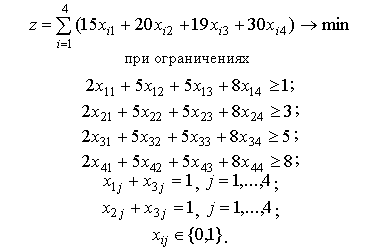 Автотранспортная компания для перевозки грузов располагает четырьмя автомашинами следующей грузоподъемности: машина 1 - 2 т, машина 2 и машина 3 - по 5 т, машина 4 - 8 т. Для каждой автомашины известна стоимость ее эксплуатации за день: для машины 1 - 15 единиц, для машины 2 - 20 единиц, для машины 3 - 19 единиц, для машины 4 - 30 единиц. Необходимо в течение одного дня развести грузы четырем получателям. В книжный магазин нужно доставить груз весом в 1 т, в мебельный магазин - в 3 т, в фермерское хозяйство - в 5 т и на сталелитейный завод - в 8 т. Предположим, что одна и та же машина не может доставлять груз в книжный или мебельный магазин и на ферму. Требуется так назначить автомашины для доставки всех грузов, чтобы суммарные затраты были минимальными.