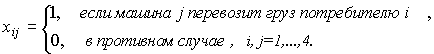Здесь через xij обозначен факт поставки i-му потребителю груза j-ой машиной, т.е.