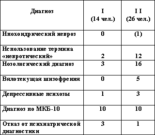 8 молодых психиатров использовали термин «невроз» (стаж 1-3 года), два психиатра диагностировали «ипохондрическое развитие личности» (стаж 30 и 1 год);
