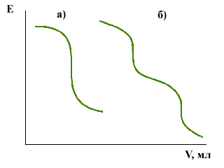 Процедура ионометрического титрования несложна. В анализируемую пробу, в которую погружены ионоселективный электрод и электрод сравнения, добавляется титрант, который связывает определяемое вещество. После каждой добавки записываются показания электродов. Кривая титрования в координатах E (потенциал электродов) от V (объем титранта) имеет ярко выраженный S-образный вид. Точка перегиба этой кривой является точкой эквивалентности (см. рис.1а). Если в анализируемом растворе присутствуют несколько определяемых ионов, то кривая имеет ступенчатый вид с несколькими точками перегиба. Каждая точка перегиба соответствует эквивалентному связыванию соответствующего определяемого иона (см. рис.1б).
