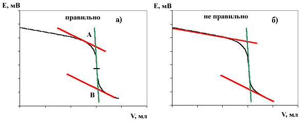 Первый способ состоит в нахождении центра симметрии кривой титрования, исходя из того, что в окрестности точки эквивалентности кривая центральносимметрична. Для нахождения центра симметрии проводится 3 прямые. Две прямые параллельны друг другу и являются касательными к некоторым участкам кривой титрования (см. на рис.2а красные линии). Чем ближе эти прямые будут находиться к точке эквивалентности, тем лучше. Третья прямая аппроксимирует точки около точки эквивалентности (см. зеленую линию). Если получившийся отрезок АB разделить пополам, то найденная точка является искомой точкой эквивалентности. Некоторые экспериментаторы предпочитают обрабатывать кривые титрования так, как это показано на рисунке 2б. Когда кривая титрования не идеально симметрична, то такая обработка результатов ошибочна, так как теряется математический смысл операции, а значит погрешность определения может быть ощутимой.