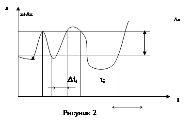 в соответствии с формулой (7) необходимо образовать дифференциальный коридор ∆х, как показано на рисунке 3, и измерить кроме значений τi’еще и τi’’, характеризующее время пребывания реализации х(t) выше уровня х+∆х, причем