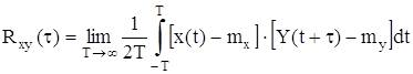- взаимная корреляционная функция. Она характеризует стохастическую связь мгновенными значениями случайных сигналов x(t) и y(t), разделенными интервалом времени τ
