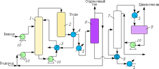 Бензол и водород поступают в основной реактор жидкофазного гидрирования 1, в который предварительно насосом в виде суспензии подается катализатор. Однородность распределения катализатора обеспечивается барботированием газа через жидкость и интенсивной циркуляцией реакционного раствора через выносной теплообменник 3, в котором генерируется технический пар низкого давления. Температура в реакторе регулируется за счет испарения циклогексана. Гидрирование проводится при 200 °С и давлении 4 МПа (парциальное давление водорода ~0,3 МПа).