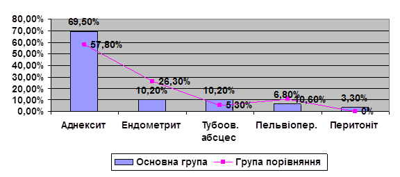 При вивченні гінекологічного анамнезу обстежених жінок, було знайдено, що 64 (94,0%) жінок основної групи, та 24 (80%) групи порівняння мали запальні захворювання органів малого тазу, що в 13 разів частіше у порівнянні з контрольною групою (6,7%).
