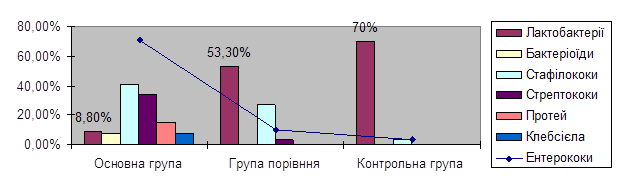 Таким чином, у ВІЛ-інфікованих першої підгрупи основної групи після лікування відбулось вірогідне зростання лактобактерії та зменшення частоти виділеної умовно-патогенної мікрофлори, як ентерококи, бактероїди, стрептококи, протей та клебсієла.