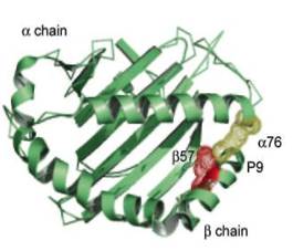 Трехмерная структура молекулы II класса была установлена в 1993 году Брауном на основе рентгеноструктурного анализа. Антигенсвязывающую бороздку молекул II класса образуют наиболее экспонированные внешние домены, α-1 и β-1. Дно бороздки сформировано b-складчатой структурой, состоящей из восьми антипараллельных участков, а стенки образованы a-спиралями (рисунок 2). Отличие антигенсвязывающей бороздки молекул II класса от таковой молекул I класса заключается в том, что в молекулах II класса она образована двумя разными цепями. Домены, образующие бороздку, и в особенности первый домен b-цепи, чрезвычайно полиморфны. Области полиморфизма собраны в несколько дискретных гипервариабельных участков (например, в b-цепи HLA-DQ они соответствуют аминокислотным остаткам в положениях 52-58, 70-77, 84-90).