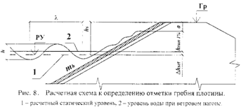 Расчет отметки гребня плотины выполняется в соответствии со Строительными нормами и правилами СНиП 2.06.05-84* "Плотины из грунтовых материалов" для двух расчетных уровней воды в верхнем бьефе водоема: НПУ и ФПУ.