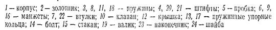 Все детали, кроме клапана 10, должны быть промыты в керосине (ГОСТ 1842–52) и обдуты сухим сжатым воздухом. После осмотра состояния всех деталей необходимо трущиеся части смазать, полости манжет наполнить смазкой ЦИАТИМ-201 (ГОСТ 6267–59) и собрать клапан.