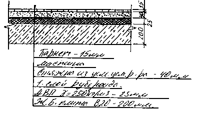Перекрытие состоит из монолитной несущей плиты γ = 2500 кг/м3 толщиной 200 мм, звукоизоляционной прокладки из ДВП с γ = 600 кг/м3 толщиной 25 мм, в не обжатом состоянии, цементно-песчаной стяжки γ = 1800 кг/м3 толщиной 40 мм, паркета толщиной 15 мм, γ = 700 кг/м3.