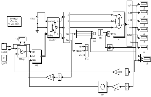 Схема на рис. 6.1 содержит: двигатель трехфазный с постоянными магнитами на роторе (М2), схему управления инвертором (RRT), инвертор напряжения (Invertor1), путевой датчик фазовый ПДФ (PDF).