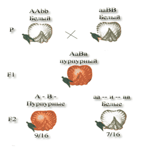 К комплементарным, или дополнительно действующим, генам относятся такие неаллельные гены, которые при совместном проявлении обуславливают развитие нового признака. На примере наследования окраски цветков у душистого горошка можно понять сущность комплементарного действия генов. При скрещивании двух рас этого растения с белыми цветками у гибридов F1 цветки оказались пурпурными. При самоопылении растений из F1 в F2 наблюдалось расщепление растений по окраске цветков в отношении близком к 9:7. пурпурные цветки были обнаружены у 9/16 растений, белые у 7/16. Объяснение такого результата состоит в том, что каждый из доминантных генов не может вызвать появление окраски, определяемой пигментом антоцианом. У душистого горошка есть ген А, обусловливающий синтез бесцветного предшественника пигмента — пропигмента. Ген В определяет синтез фермента, под действием которого из пропигмента образуется пигмент. Цветки душистого горошка с генотипом ааВВ и ААbb имеют белый цвет: в первом случае есть фермент, но нет пропигмента, во втором -есть пропигмент, но нет фермента, переводящего пропиг-мент в пигмент. Проведем скрещивание двух растений ду шистого горошка с белыми цветками: У дигетерозиготных растений есть и пропигмент (А), и фермент (В), участвующие в образовании пурпурного пигмента. Формирование такого, казалось бы, элементарного признака, как окраска цветков, зависит от взаимодействия по крайней мере двух неаллельных генов, продукты которых взаимно дополняют друг друга. Такая форма взаимодействия генов разных аллельных пар носит название комплементарности — взаимодополнения.