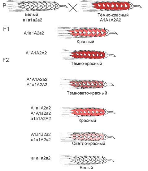 В некоторых случаях установлено, что проявление конкретного признака зависит от количества доминантных генов, вносящих вклад в его развитие. Например, при скрещивании краснозерных пшениц с белозерными было установлено, что растения с генотипом А1А1А2А2 имеют красные зерна, растения а1а1а2а2 – белые зерна, растения с тремя доминантными генами – красноватую окраску, а растения с двумя и одним геном – более бледную окраску. Таким образом, накопление определенных аллелей в генотипе может вести к изменению выраженности признаков.