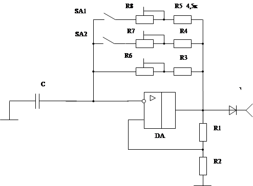 Составим принципиальную схему устройства, где для устранения разброса параметров элементов схемы включим подстроечные резисторы, а вычисленные значения сопротивлений получим путем параллельного подключения резисторов к R”.