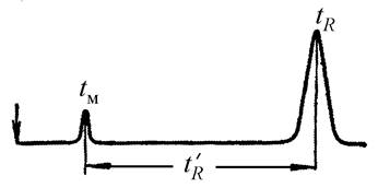 Время от момента ввода пробы в колонку до выхода максимума пика называется временем удерживания tR (рис. 4.1.1). Оно складывается из двух составляющих: времени нахождения молекул соединения в газовой фазе