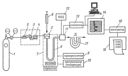 Схема современного газового хроматографа изображена на рис. 3. Для создания перепада давления через колонку хроматограф подсоединяют к источнику со сжатым газом 1 (баллонная или лабораторная линия со сжатым газом). Через колонку поток газа-носителя должен проходить с постоянной и определенной скоростью, поэтому на входе в колонку на линии газа-носителя устанавливают регулятор и стабилизатор расхода газа-носителя 2 и измеритель расхода газа 3. Если газ-носитель загрязнен нежелательными примесями, то в этом случае устанавливается еще фильтр 4. Таким образом, на входе в колонку подключается ряд устройств, часто объединяемых в один блок (блок подготовки газа), назначение которого — установка, стабилизация, измерение и очистка потока газа-носителя. Перед входом в колонку устанавливается устройство для ввода анализируемой пробы в колонку — дозатор-испаритель 5. Обычно анализируемую пробу вводят микрошприцем 8 через самозатекающее термостойкое резиновое уплотнение в дозаторе, газовые пробы вводят дозирующим шестиходовым краном.